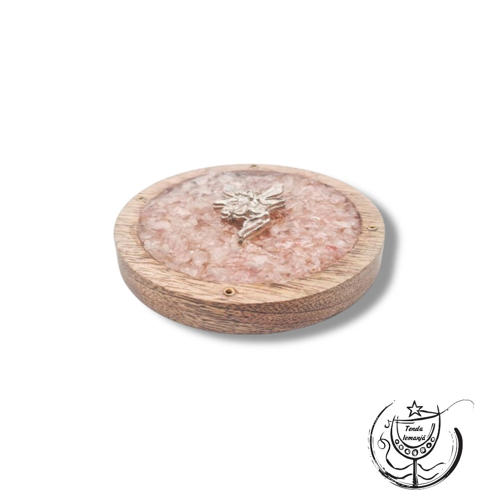 Incensário Tábua de Madeira Círculo Símbolo Fada com pedras de Quartzo Rosa em Chips
