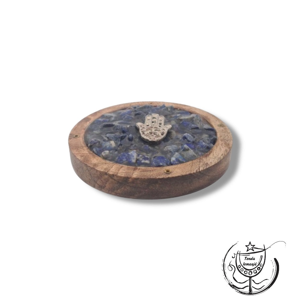 Incensário Tábua de Madeira Círculo Símbolo Mão de Fátima com pedras de Lápis Lazúli em Chips