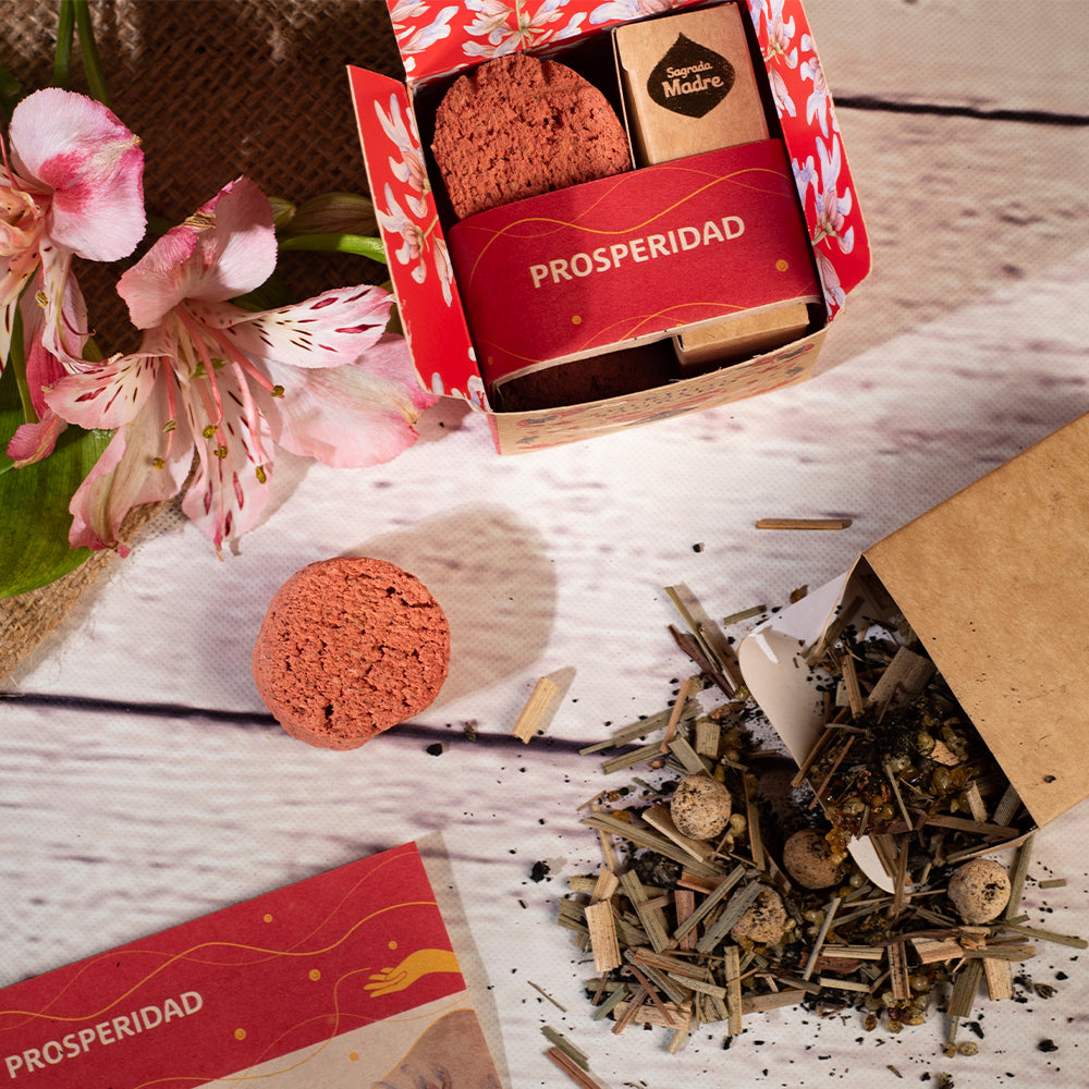 O Kit de defumação Sagrada Madre Prosperidade, tem uma composição cuidadosamente selecionada para proporcionar uma energia limpa e renovada. Quando os aromas se espalham no ambiente a magia acontece: o aroma do benjoim oferece uma sensação de bem-estar, a resina yagra promove a coragem, o estoraque reforça o poder interior e o perfume do incenso convida a celebrar a prosperidade.