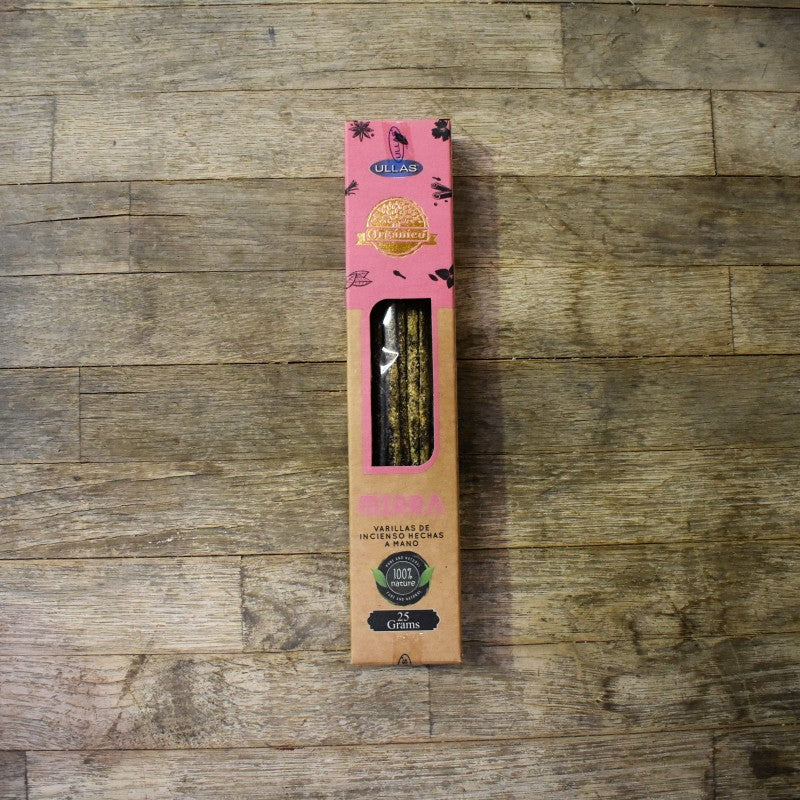 Estes incensos são feitos com resinas orgânicas de diferentes origens e enriquecidos com os seus óleos essenciais naturais. Sua fragrância promove o relaxamento e a meditação como prática diária, ao mesmo tempo em que preenche a atmosfera com um aroma profundamente inebriante. Essas misturas são feitas de acordo com a antiga prática das culturas maia e inca de queimar incenso em seus rituais. Este incenso orgânico tem uma fragrância requintada de mirra.